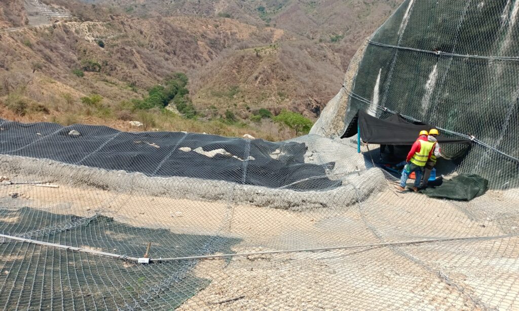 Las zonas más verticalizadas y de mayor inestabilidad se reforzaron mediante sistemas flexibles con mallas de alta resistencia tipo 3STUTOR, instaladas según un modelo unidireccional con cables de refuerzo horizontales. En áreas con presencia de suelos de alteración o materiales sueltos, estas soluciones se combinaron con geomantos y, puntualmente, con concreto proyectado, permitiendo un control eficaz de la erosión sin comprometer la permeabilidad del sistema.