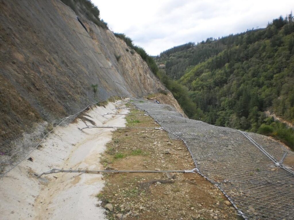 La solución adoptada se basó en sistemas flexibles de estabilización compuestos por anclajes al terreno combinados con membranas continuas de alambre de acero de alta resistencia y baja deformación estructural. Estos sistemas permiten contener el material potencialmente inestable, transmitiendo los esfuerzos generados por el empuje del terreno hacia zonas estables del macizo, al tiempo que se controla el desplazamiento del talud mediante una presión estabilizadora uniforme.
